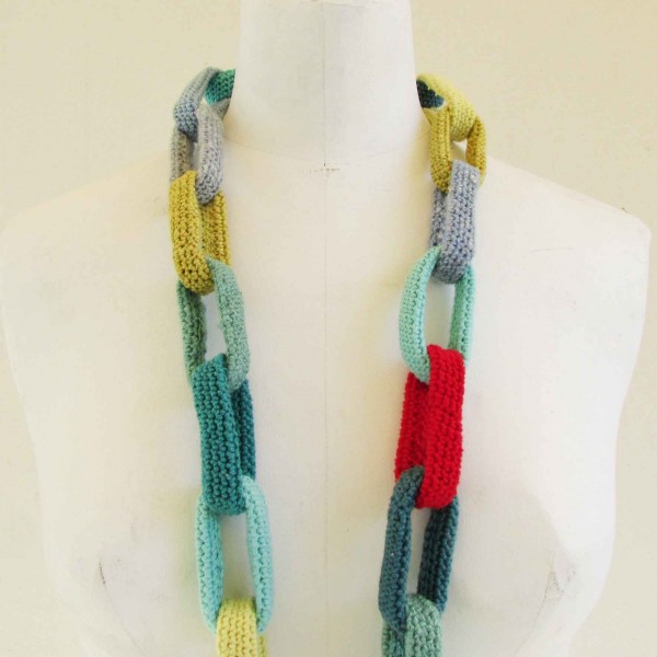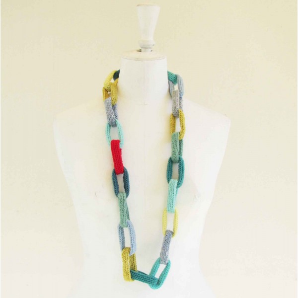 Sautoir chaîne, anneaux crocheté, aquamarine, bleu ciel, anis et rouge
