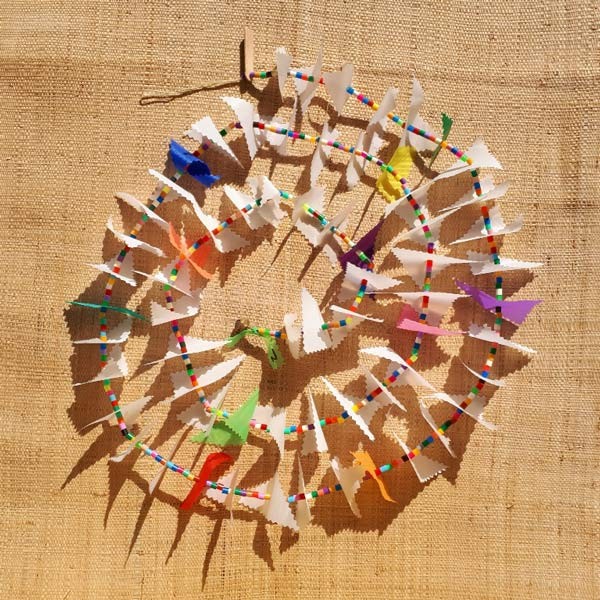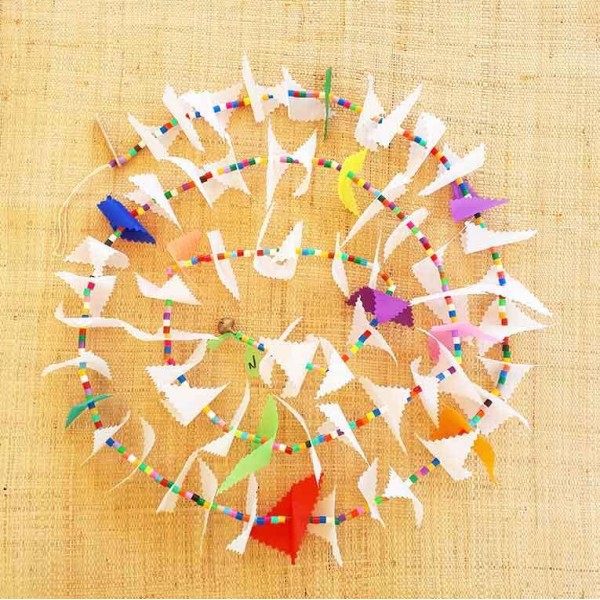 Cette guirlande blanche aux quelques touches multicolores est créée avec des triangles en tissu pour spinnaker recyclé et des "perles à écraser" multicolores enfilés sur un fil de coton. Le jour du confinement et la date correspondante sont identifiés sur une petite plaque de bois en haut de chaque guirlande et un grelot est fixé à l'autre extrémité. Chaque guirlande est unique.
