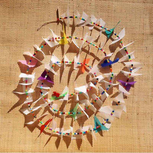 Cette guirlande blanche aux touches de couleurs est créée avec des triangles en tissu pour spinnaker recyclé et des "perles à écraser" multicolores enfilés sur un fil de coton. Le jour du confinement et la date correspondant sont identifiés sur une petite plaque de bois en haut de chaque guirlande et une perle en forme de poisson en bois rouge fixé à l'autre extrémité. Chaque guirlande est unique.