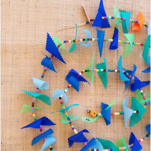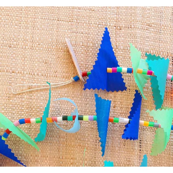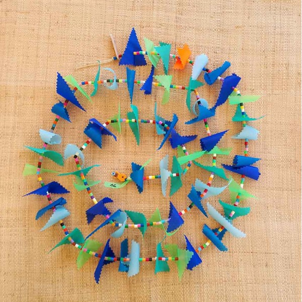 Cette guirlande en dégradé de bleus et verts est créée avec des triangles en tissu pour spinnaker recyclé et des "perles à écraser" multicolores enfilés sur un fil de coton. Le jour du confinement et la date correspondante sont identifiés sur une petite plaque de bois en haut de chaque guirlande et une perle poisson orange est fixée à l'autre extrémité. Chaque guirlande est unique.