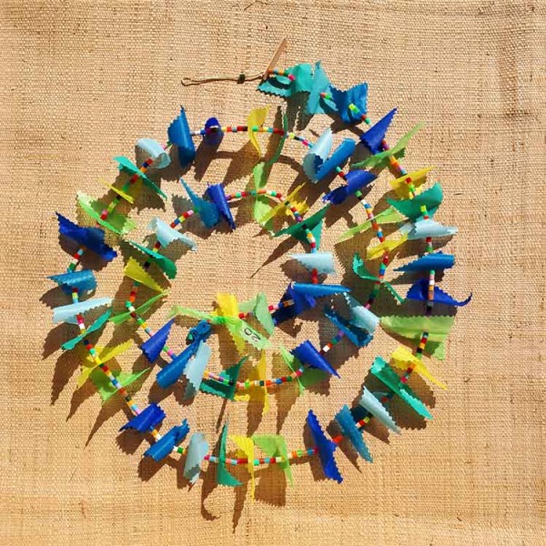 Cette guirlande en dégradé de bleus, verts et jaune est créée avec des triangles en tissu pour spinnaker recyclé et des "perles à écraser" multicolores enfilés sur un fil de coton. Le jour du confinement et la date correspondante sont identifiés sur une petite plaque de bois en haut de chaque guirlande et une perle poisson bleue est fixée à l'autre extrémité. Chaque guirlande est unique.