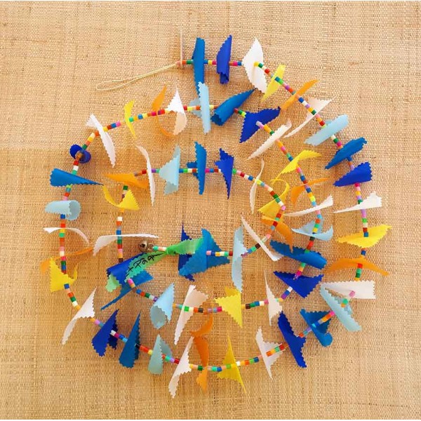Cette guirlande en harmonie de bleus, orange, jaune et blanc est créée avec des triangles en tissu pour spinnaker recyclé et des "perles à écraser" multicolores enfilés sur un fil de coton. Le jour du confinement et la date, le dimanche de Pâques, sont identifiés sur une petite plaque de bois en haut de chaque guirlande et un grelot est fixé à l'autre extrémité. Chaque guirlande est unique.