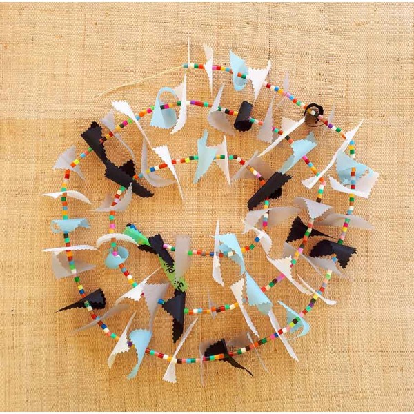Cette guirlande bleu ciel, gris, noir et blanc est créée avec des triangles en tissu pour spinnaker recyclé et des "perles à écraser" multicolores enfilés sur un fil de coton. Le jour du confinement et la date correspondante sont identifiés sur une petite plaque de bois en haut de chaque guirlande et une perle poisson bleue est fixée à l'autre extrémité. Chaque guirlande est unique.