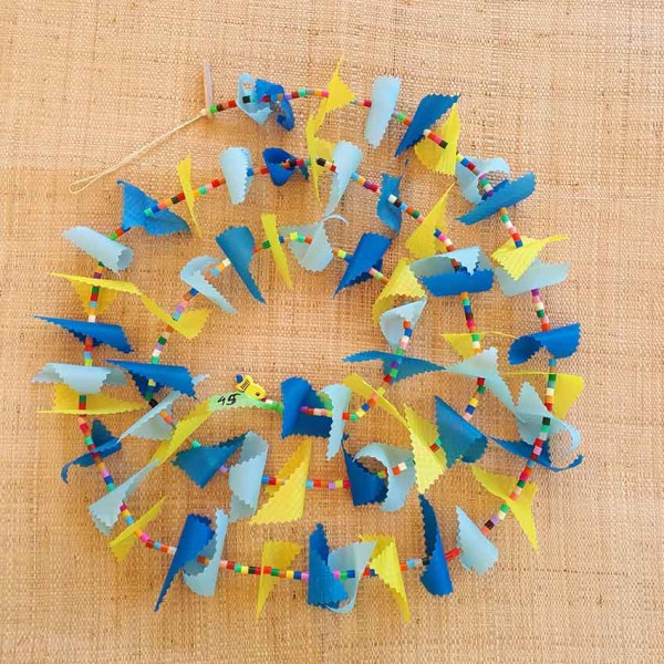 Cette guirlande en harmonie de bleus et jaune est créée avec des triangles en tissu pour spinnaker recyclé et des "perles à écraser" multicolores enfilés sur un fil de coton. Le jour du confinement et la date correspondante sont identifiés sur une petite plaque de bois en haut de chaque guirlande et une perle poisson jaune est fixée à l'autre extrémité. Chaque guirlande est unique.