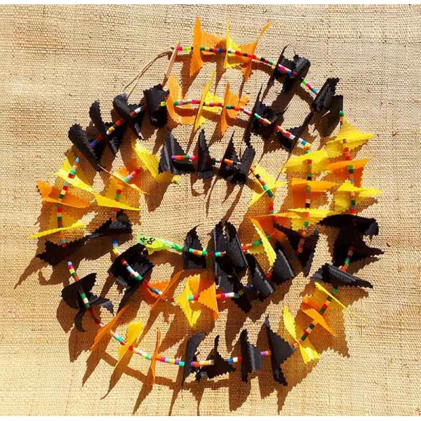 Cette guirlande en harmonie de noir, orange et jaune est créée avec des triangles en tissu pour spinnaker recyclé et des "perles à écraser" multicolores enfilés sur un fil de coton. Le jour du confinement et la date correspondante sont identifiés sur une petite plaque de bois en haut de chaque guirlande et une perle poisson jaune est fixée à l'autre extrémité. Chaque guirlande est unique.