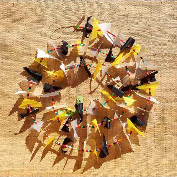 Cette guirlande en harmonie de noir, gris, jaune et blanc est créée avec des triangles en tissu pour spinnaker recyclé et des "perles à écraser" multicolores enfilés sur un fil de coton. Le jour du confinement et la date correspondante sont identifiés sur une petite plaque de bois en haut de chaque guirlande et une perle poisson jaune est fixée à l'autre extrémité. Chaque guirlande est unique.