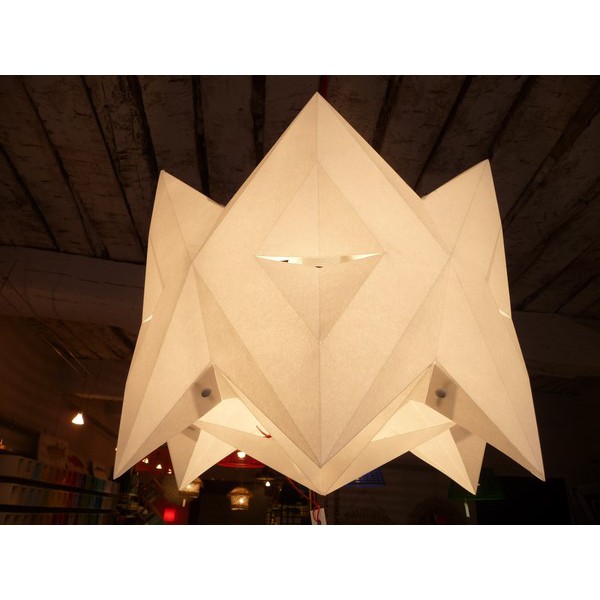 Cette suspension est conçue d'une seule pièce, incisée, pliée et coupée, sans collage. Ces pièces uniques sont réalisées en parchemin naturel, matériau organique ancestral, spécialement traité pour résister à la chaleur.